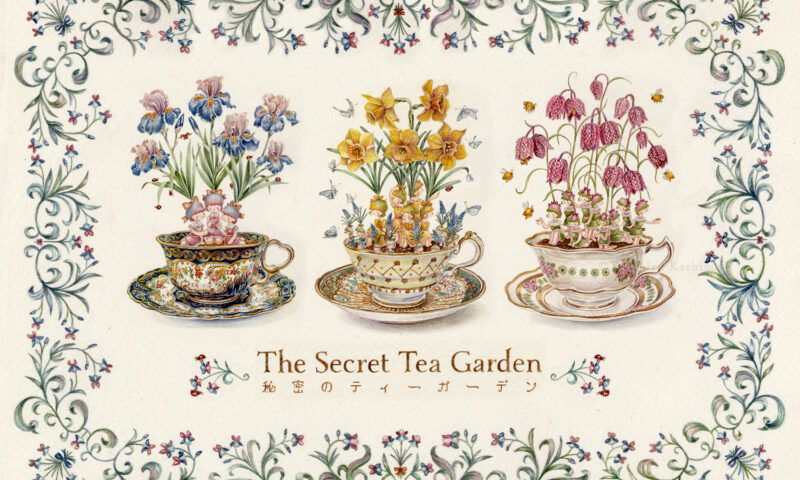 こちらの作品は、一作目の絵本に登場する『ティーとカメレオン』の庭にある植木鉢を描いたものです。この可愛い植木鉢に佇むのは、可愛いお花たち。皆春になるとティーがいれる美味しい紅茶目当てに植木鉢に集まります。ティーは庭のお花に水の代わりに紅茶をあげるのですが、紅茶にしてからというもの、ただの水やりが、お花たちとの楽しいお茶会になって、水やりに何時間もかかってしまうのでした。